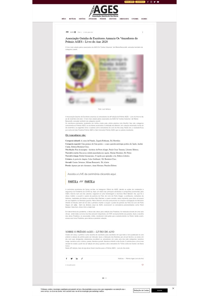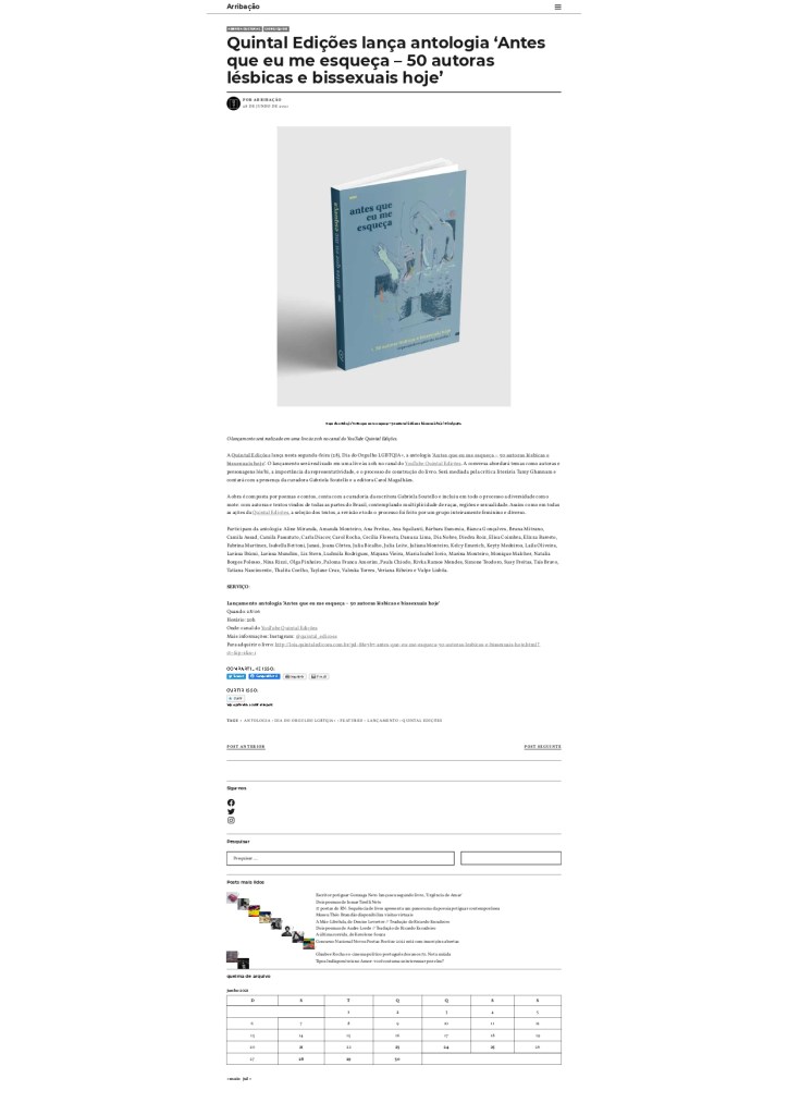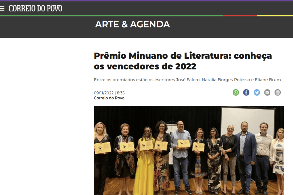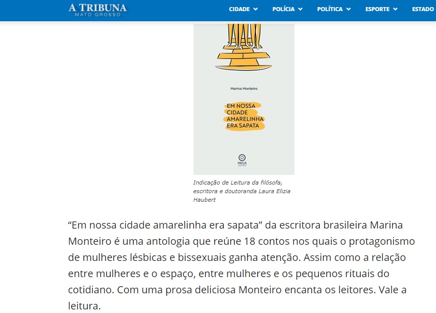Mídia “Em nossa cidade amarelinha era sapata” reúne contos sobre lésbicas e bissexuais matéria prêmio AGES na ZH livro Em nossa cidade amarelinha era sapata no Literatura RS texto Carne de segunda selecionado na convocatória de dramaturgias da Cia. Senhas lançamento do livro Contos de vista, Pontos de queda – Literatura RS livros ganhadores do Prêmio Minuano de Literatura 2022